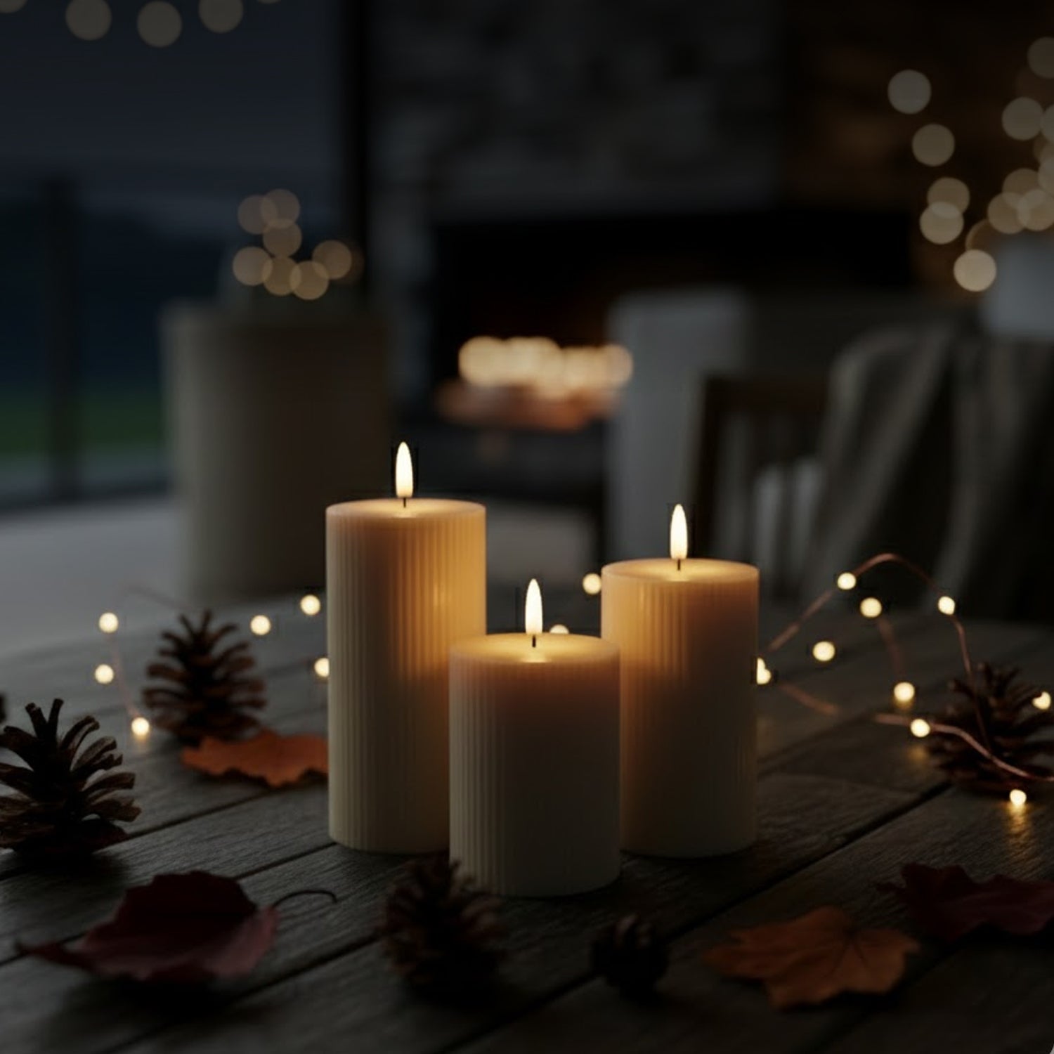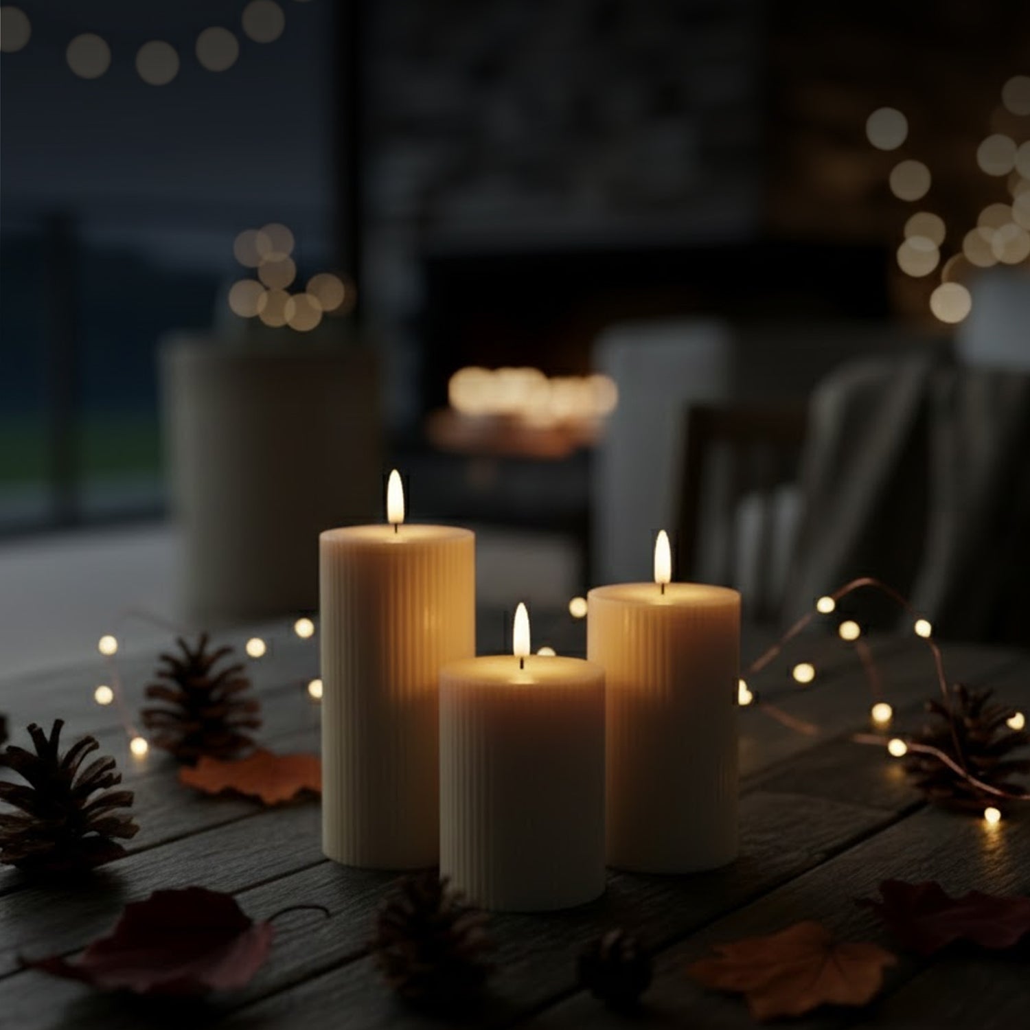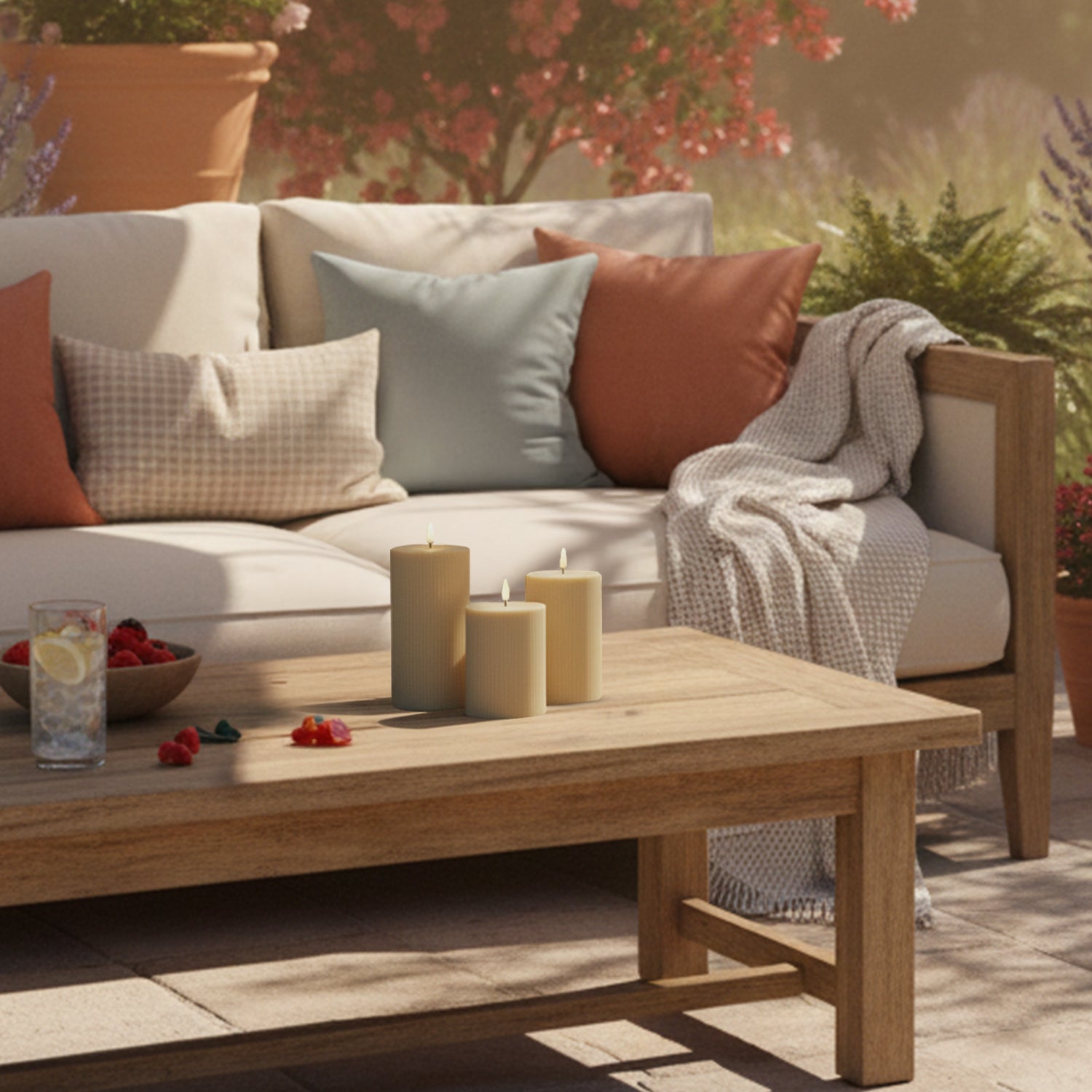 The modern ribbed design and neutral beige color fit effortlessly into any interior. From sideboards to covered outdoor tables, these candles create an inviting atmosphere everywhere.