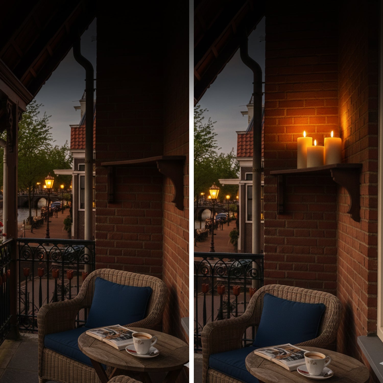 The candles are made of sturdy plastic (no wax), so they do not melt or deform at higher temperatures. Perfect for use in dry, covered outdoor locations such as balconies, conservatories, verandas, or under a garden canopy.