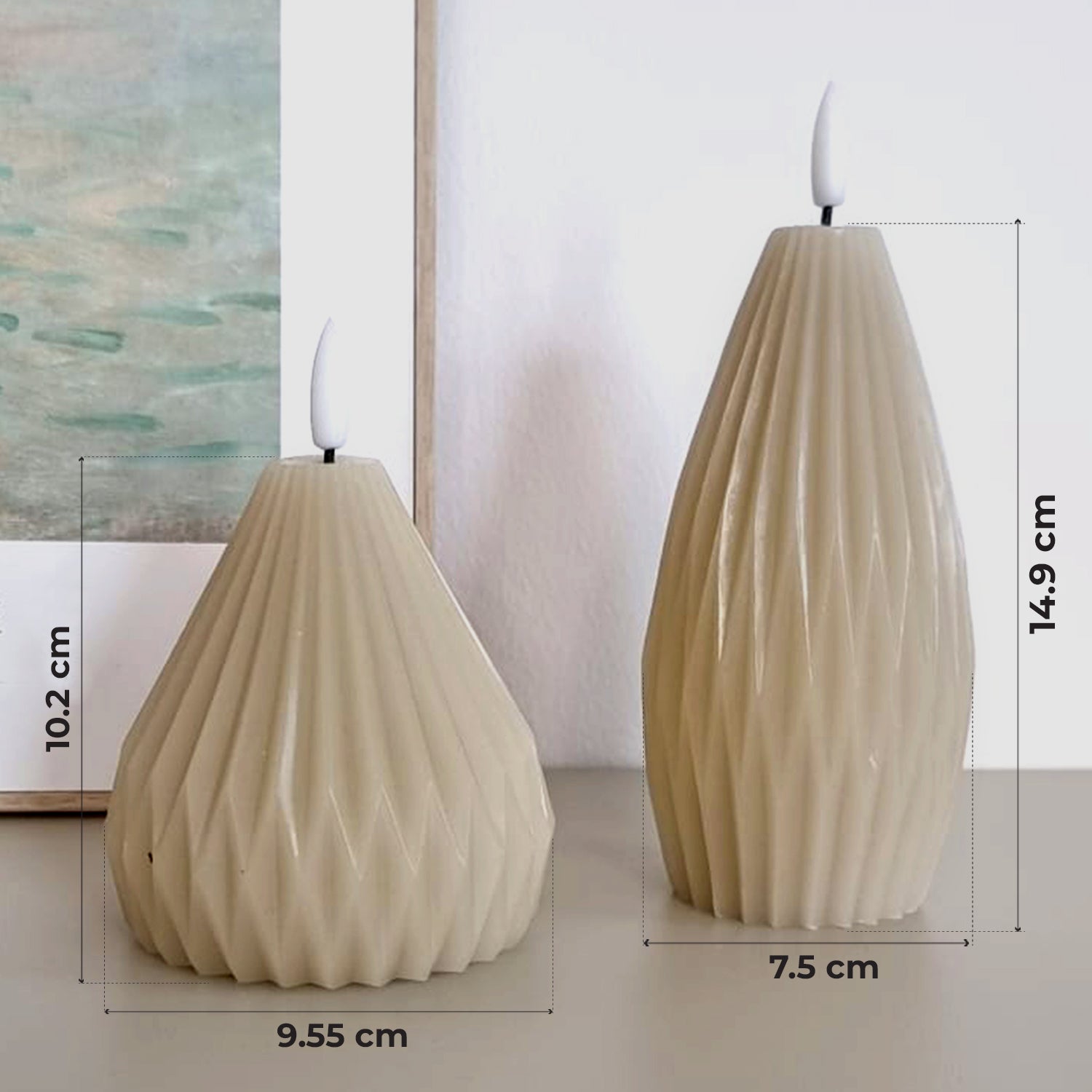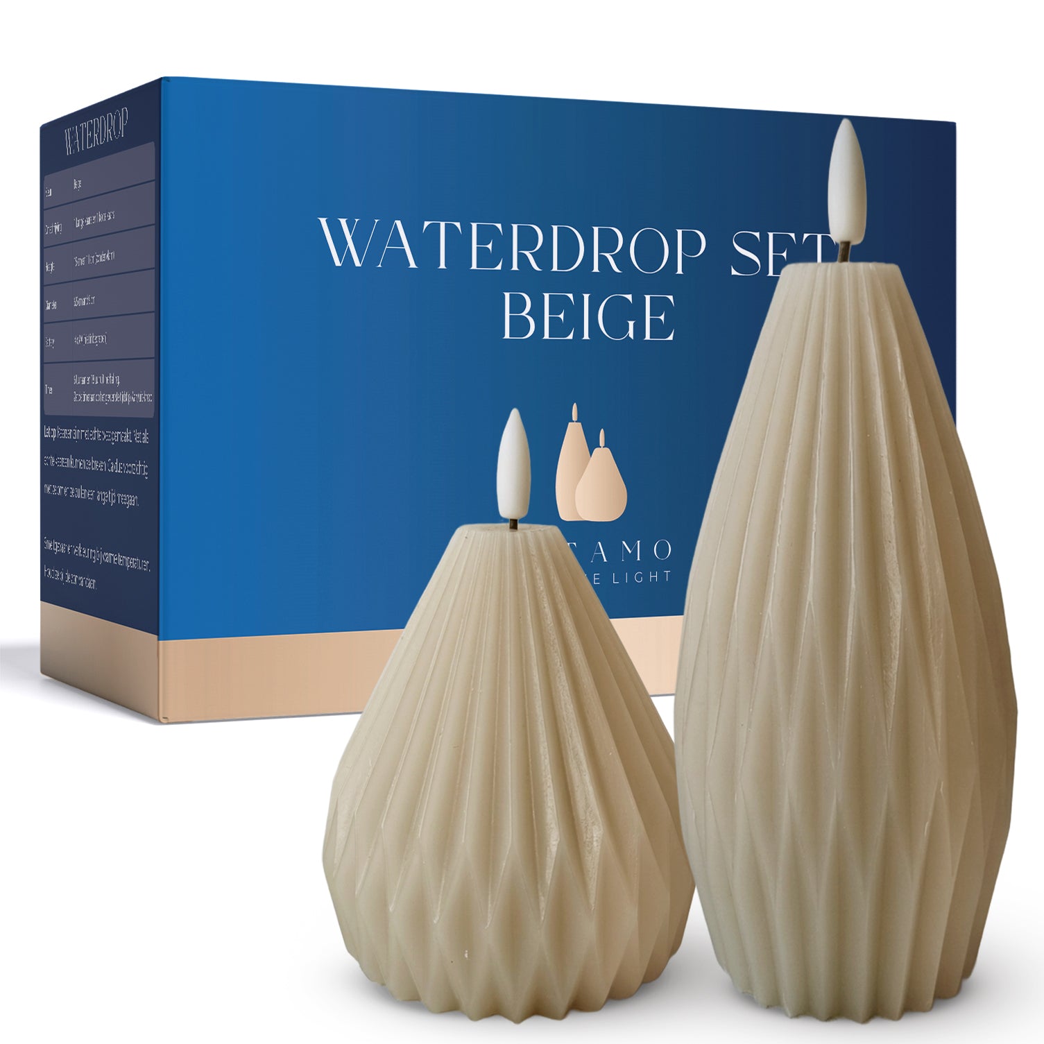 Bring warmth, style, and relaxation into your home with the VITAMO Waterdrop LED candles made of real wax. This 2-piece set in beige features an elegant droplet shape with a fine pleat structure and a realistic flickering LED flame. This allows you to enjoy the charm of traditional candles, but without smoke, soot, odor, or fire hazard. Perfect for every day, every interior, and every moment.